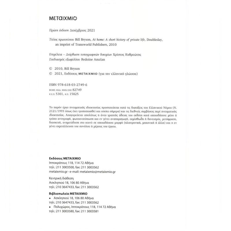 Για να απαντήσει σε αυτά και πολλά ακόμα ερωτήματα, ο Bill Bryson περιπλανιέται στο σπίτι του και αποκαλύπτει τα νήματα που συνδέουν αναπάντεχα τα πράγματα γύρω μας, σε ένα από τα πιο ψυχαγωγικά και διαφωτιστικά βιβλία που έχουν γραφτεί ποτέ για τον τρόπο ζωής μας.
