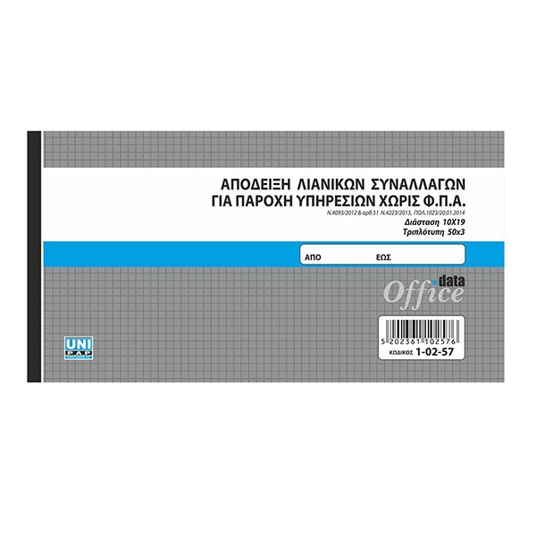Απόδειξη Λιανικών Συναλλαγών Για Παροχή Υπηρεσιών Χωρίς ΦΠΑ - Τριπλό (10x19) - Unipap