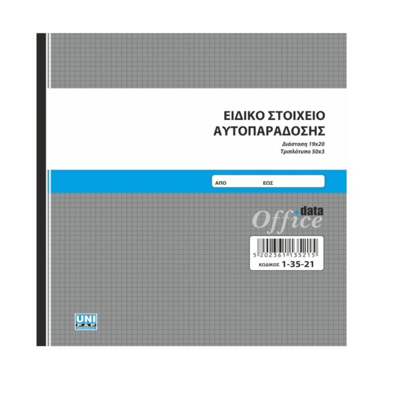 Ειδικό στοιχείο αυτοπαράδοσης, τριπλότυπο αυτογραφικό χαρτί (1 πρωτότυπο και 2 αντίγραφα), με 1 συντελεστή ΦΠΑ από την Uni Pap.