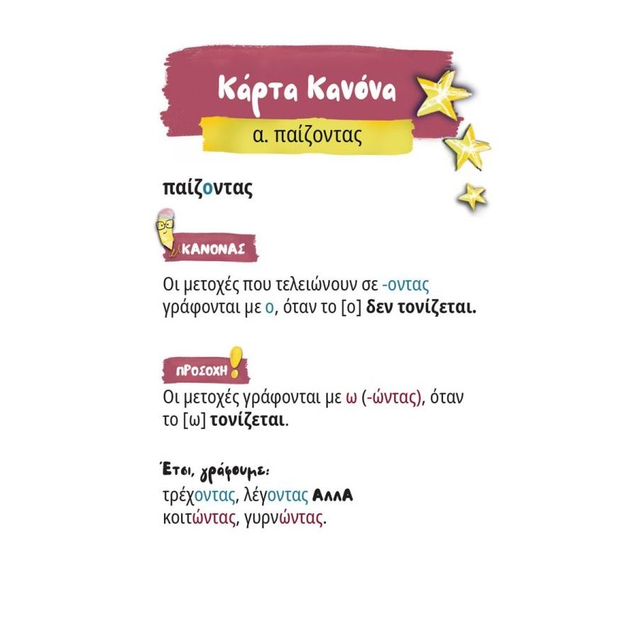 1.Διπλή αποστολή: Μπορείς να βρεις πώς γράφεται η λέξη και ποιος είναι ο κανόνας που καθορίζει την ορθογραφία της; Αν ΝΑΙ, κερδίζεις το ΜΠΡΑΒΟ. Ή διάβασε το πίσω μέρος της κάρτας για να μάθεις τα πάντα και την επόμενη φορά να είσαι νικητής.
