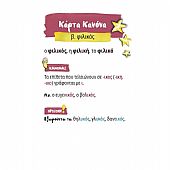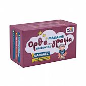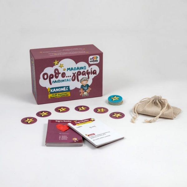 Περιλαμβάνει όλους τους κανόνες ορθογραφίας της ύλης της Α’ & Β’ Δημοτικού και κανόνες για προετοιμασία για τη Γ΄ Δημοτικού. Επιπλέον, έχει 24 καρτελάκια επιβράβευσης και 1 πουγκί για την εύκολη μεταφορά των καρτών. Περιλαμβάνει όλους τους κανόνες της ύλης της Α’ και Β’ Δημοτικού, καθώς και επιπλέον κανόνες. Έχει 4 επίπεδα δυσκολίας: κάρτες πρώτης ορθογραφίας για τους πρώτους μήνες της Α’ Δημοτικού, κάρτες για το β’ μισό της Α’ Δημοτικού, κάρτες για τη Β’ Δημοτικού και κάρτες επιπλέον κανόνων, για προετοιμασία για τη Γ’ Δημοτικού.