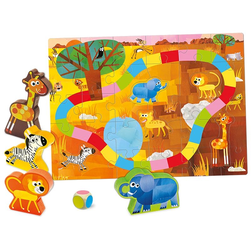 Αυτό το σετ περιλαμβάνει τρία απλά και διασκεδαστικά παιχνίδια, κατάλληλα για τις μικρές ηλικίες. Το παιδί συνθέτει ένα παζλ 24 μεγάλων κομματιών που απεικονίζει τη σαβάνα, το οποίο στη συνέχεια γίνεται η βάση για ελεύθερο συμβολικό παιχνίδι καθώς περιέχει τα 5 μικρά νεογνά των ζώων της εικόνας, κατασκευασμένα από ξύλο. Τέλος, το παιδί χρησιμοποιώντας το ζάρι και τις ξύλινες φιγούρες-ζωάκια μπορεί να παίξει ένα εύκολο και διασκεδαστικό παιχνίδι με βάση τα χρώματα. Ένα ολοκληρωμένο σετ με δραστηριότητες που βοηθούν το παιδί να αναπτύξει τη λογική του, τη λεπτή κινητικότητά του, να απελευθερώσει τη φαντασία του και να μάθει βασικούς κανόνες επιτραπέζιων παιχνιδιών.