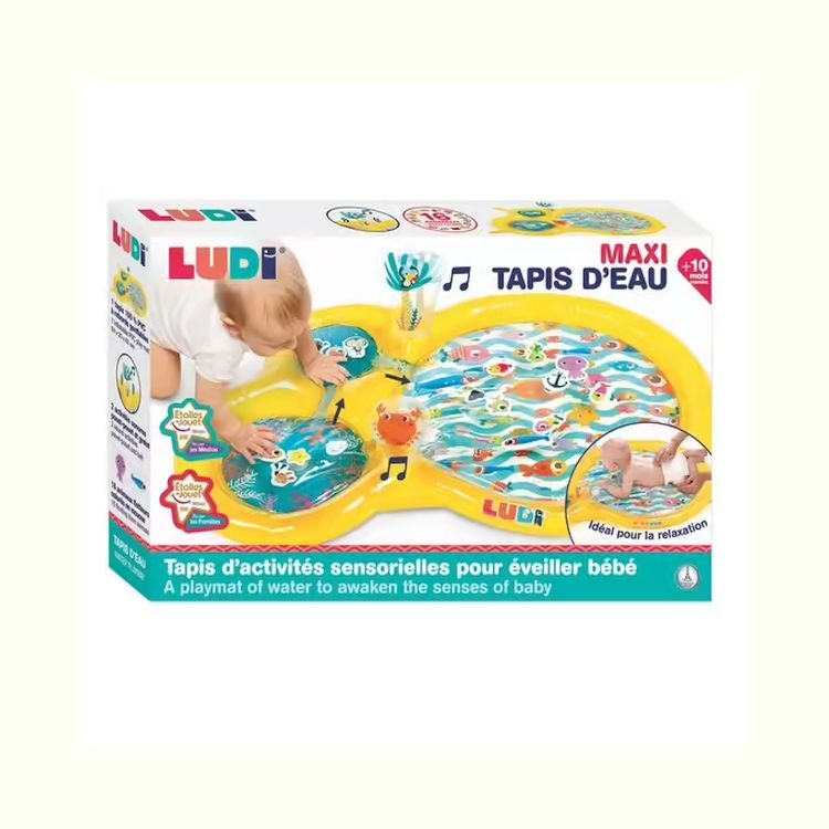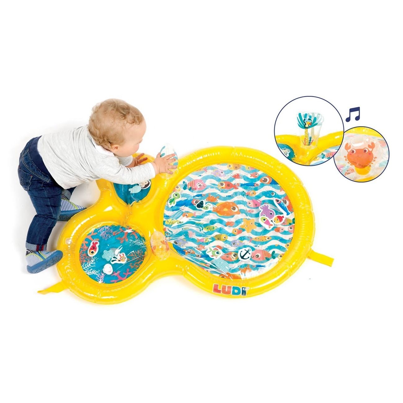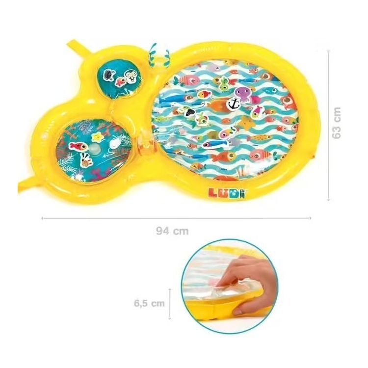 Το βρεφικό χαλάκι ανακάλυψης νερού της εταιρείας Ludi είναι μια καινούργια περιπέτεια για το μωράκι σας καθώς θα ανακαλύψει πολλά διαφορετικά υλικά και σχήματα, ενώ θα αναπτύξει τις κινητικές του δεξιότητες και θα διεγείρει τις αισθήσεις του. Γεμίστε με νερό το χαλάκι και αφήστε το παιδί να πιέσει τις επιφάνειές του. Η ροή του νερού μεταφέρεται σε όλα τα μέρη του χαλιού, δημιουργώντας του έκπληξη από τον θόρυβό της. Παρατηρήστε την κίνηση που δημιουργείται … Ψάρια, πιγκουίνοι, καβούρια, αστερίες και ένας μικρούλης δύτης χορεύουν μπροστά στα μάτια μας. Δυο φουσκωτές λαβές επίσης βρίσκονται στο πάνω μέρος του χαλιού και κουδουνίζουν όταν τις πιέσει. Κατασκευασμένο από 100% PVC κατάλληλο για ηλικίες από 10 μηνών και πάνω. Τα πλαϊνά φουσκώνουν με αέρα και το σώμα μπορεί να γεμίσει με νερό της βρύσης.