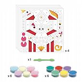 Περιλαμβάνει: 6 βαζάκια με χρωματιστή άμμο, 6 βαζάκια με χρωματιστή άμμο που φωσφορίζει στο σκοτάδι, 4 προσχεδιασμένες κάρτες, 1 εξάρτημα για την αφαίρεση των αυτοκόλλητων και ένα εγχειρίδιο με αναλυτικές οδηγίες.