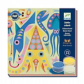 Χειροτεχνία από τη εταιρεία Djeco. Μία μοναδική εικαστική τεχνική με χρωματιστή άμμο. Αφαιρέστε το αυτοκόλλητο με το ειδικό εργαλείο και τοποθετήστε πάνω το αντίστοιχο χρώμα άμμου. Δείτε τα ζωάκια της θάλασσας και στο σκοτάδι! Τα χρώματά τους αλλάζουν! Μπορείτε να αδειάστε την άμμο που θα περισσέψει στην ειδική τρυπούλα, που βρίσκεται στην άκρη του κουτιού και να αποθηκευτεί στο βαζάκι της.
