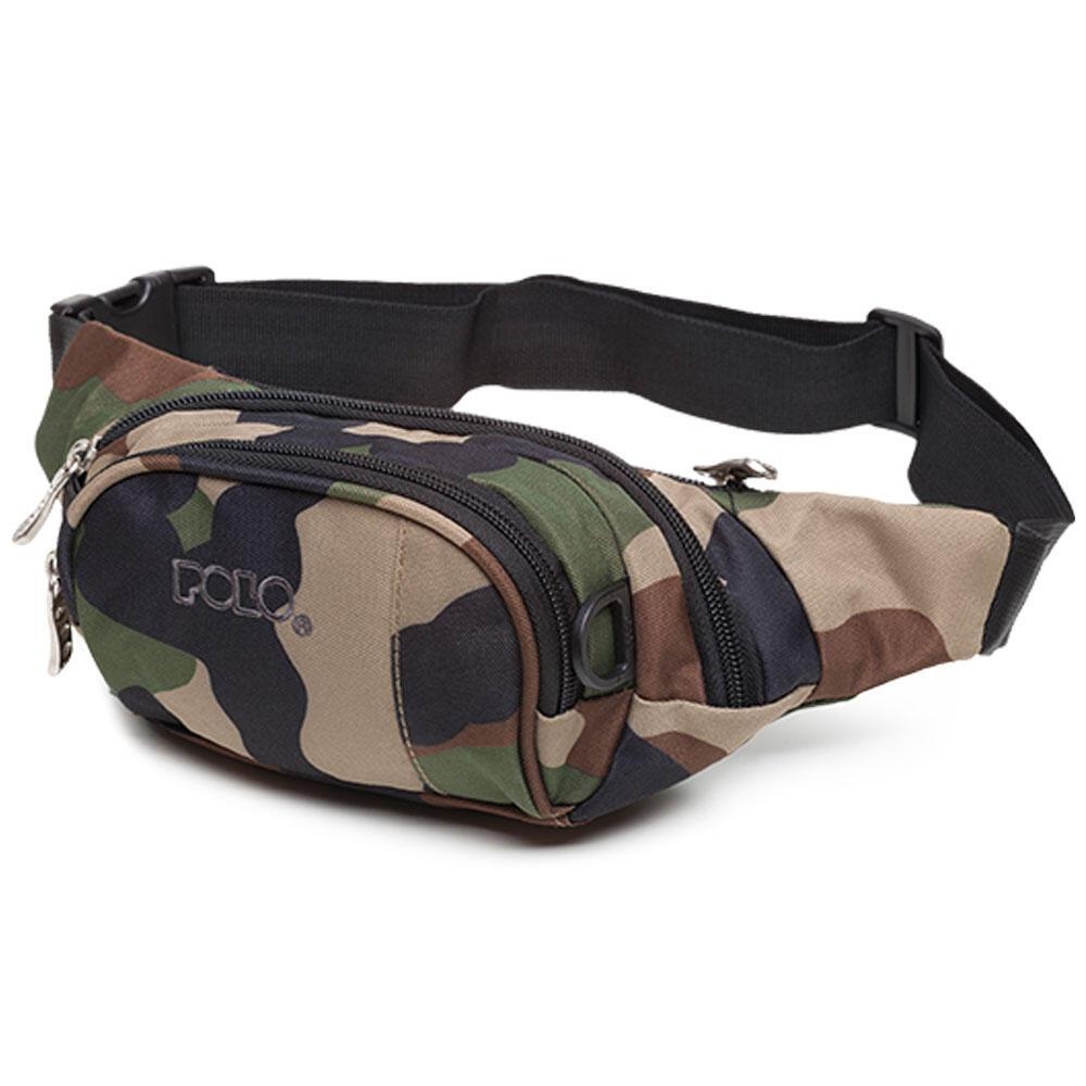 Tσαντάκι μέσης (μπανάνα) Polo, με μια κεντρική θήκη, μία κρυφή στο πίσω μέρος, μια μικρότερη στο μπροστινό μέρος, πλαϊνό τσεπάκι με δίχτυ καθώς και σταθερό ρυθμιζόμενο ιμάντα μέσης που ασφαλίζει με τρίαινα.