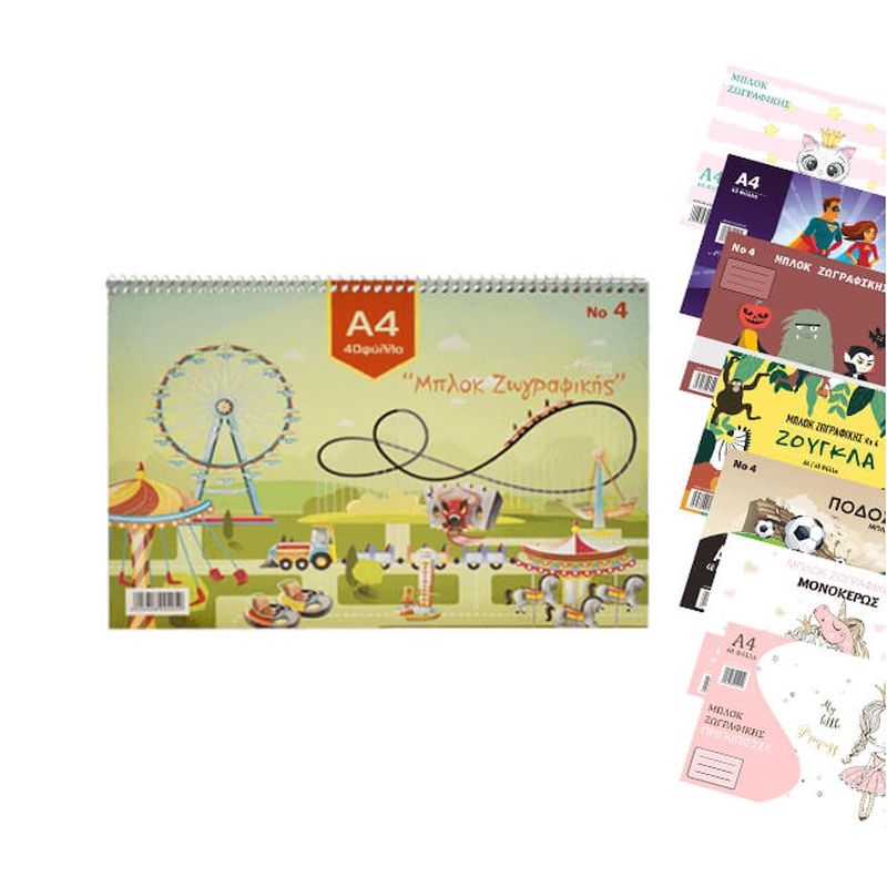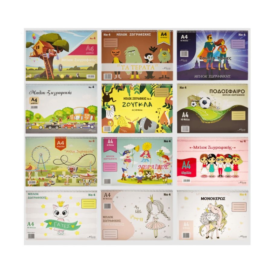 Οριζόντιο μπλοκ ζωγραφικής σπιράλ A4, 40 φύλλων, με όμορφα σχέδια για μικρά παιδιά.