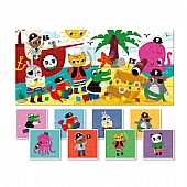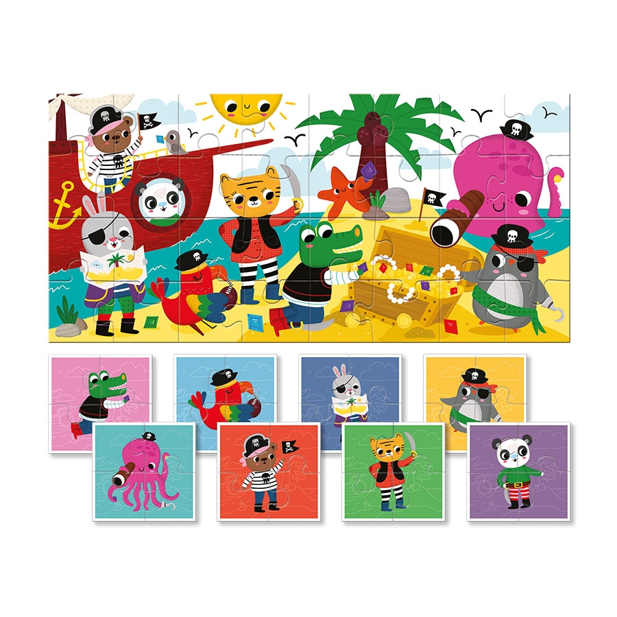 Ένα πρωτότυπο παζλ με 32 κομμάτια διπλής όψεως για τους μικρούς μας φίλους! Από την μία πλευρά, το παιδί συνθέτει 8 παζλ-πειρατές των 4 κομματιών και από την άλλη πλευρά, όλα μαζί τα κομμάτια μπορούν να συνθέσουν μια μεγάλη εικόνα. Έτσι το παιδί μπορεί να ξεκινήσει με τα μικρότερα παζλάκια και σταδιακά να μεταβεί στην ολοκλήρωση του μεγαλυτέρου, αναπτύσσοντας τη συγκέντρωση, την παρατηρητικότητα και τη λογική!