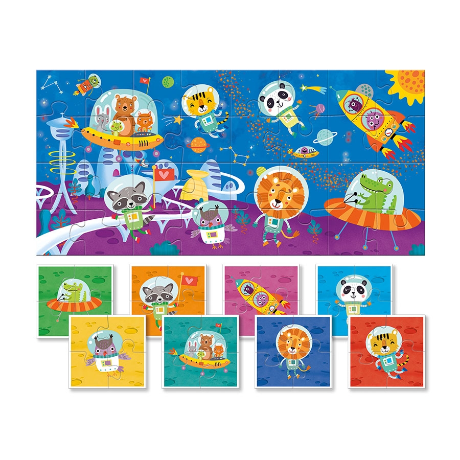 Ένα πρωτότυπο παζλ με 32 κομμάτια διπλής όψεως για τους μικρούς μας φίλους! Από την μία πλευρά, το παιδί συνθέτει 8 παζλ-Διάστημα των 4 κομματιών και από την άλλη πλευρά, όλα μαζί τα κομμάτια μπορούν να συνθέσουν μια μεγάλη εικόνα. Έτσι το παιδί μπορεί να ξεκινήσει με τα μικρότερα παζλάκια και σταδιακά να μεταβεί στην ολοκλήρωση του μεγαλυτέρου, αναπτύσσοντας τη συγκέντρωση, την παρατηρητικότητα και τη λογική!