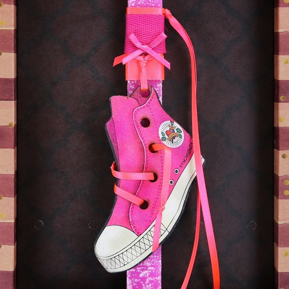 Πασχαλινή χειροποίητη λαμπάδα με ξύλινο ρετρό στολίδι παπούτσι τύπου All-star. Η κάθε λαμπάδα διατίθεται μέσα στη δική της υπέροχη οικολογική συσκευασία ιδανική για δώρο και όχι μόνο!