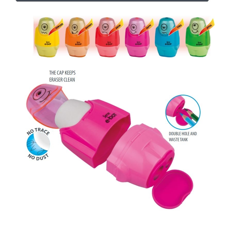 Σβήστρα και ξύστρα μαζί σε διάφορα χρώματα και νέο σχεδιασμό. Περιλαμβάνει μια διπλή ξύστρα, στο κάτω μέρος που κρατά στο δοχείο της τα ξύσματα και παράλληλα διαθέτει μια μαλακή συνθετική σβήστρα, στο πάνω μέρος, κατάλληλη για πλήθος μολυβιών γραφίτη.