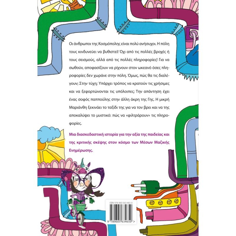 Οι άνθρωποι της Κοσμόπολης είναι πολύ ανήσυχοι. Η πόλη τους κινδυνεύει να βυθιστεί! Όχι από τις πολλές βροχές ή τους σεισμούς, αλλά από τις πολλές πληροφορίες! Για να σωθούν, αποφασίζουν να ρίχνουν στον ωκεανό όσες πληροφορίες δεν χωράνε στην πόλη. Όμως, πώς θα τις διαλέγουν; Στην τύχη; Υπάρχει τρόπος να κρατούν τις χρήσιμες και να ξεφορτώνονται τις υπόλοιπες; Την απάντηση έχει ένας σοφός παππούλης στην άλλη άκρη της Γης. Η μικρή Μαριάνθη ξεκινάει το ταξίδι της για να τον βρει και να της αποκαλύψει το μυστικό: πώς να «φιλτράρουν» τις πληροφορίες.