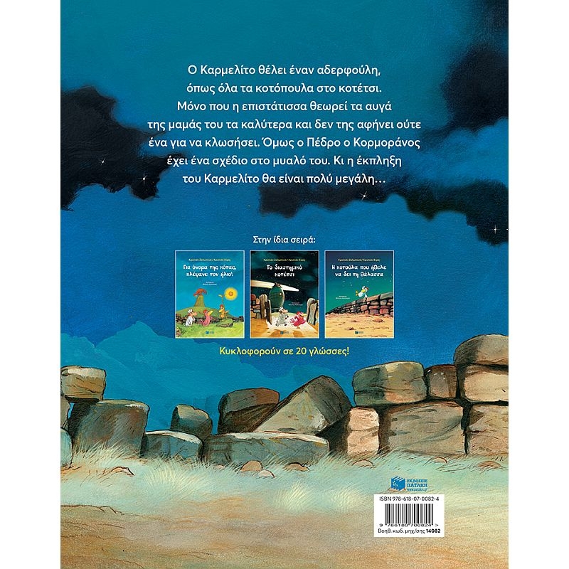 Ο Καρμελίτο θέλει έναν αδερφούλη, όπως όλα τα κοτόπουλα στο κοτέτσι. Μόνο που η επιστάτισσα θεωρεί τα αυγά της μαμάς του τα καλύτερα, και δεν της αφήνει ούτε ένα για να κλωσήσει. Όμως ο Πέδρο ο Κορμοράνος έχει ένα σχέδιο στο μυαλό του. Κι η έκπληξη του Καρμελίτο θα είναι πολύ μεγάλη…