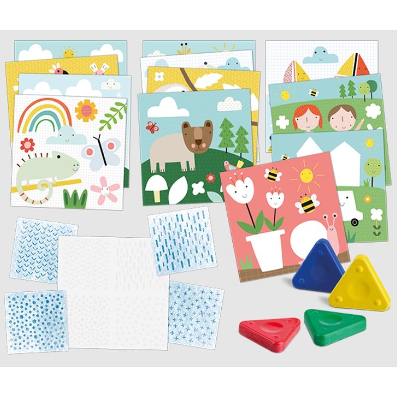 Ένα πολύ δημιουργικό παιχνίδι ζωγραφικής που θα τονώσει τη φαντασία και θα ενθαρρύνει τα παιδιά να κάνουν τα πρώτα βήματα στο σχέδιο και το χρωματισμό. Χάρη στις ανθεκτικές, τρίγωνες κηρομπογιές τα παιδιά θα διασκεδάσουν ζωγραφίζοντας στις κάρτες και χρησιμοποιώντας τα μοτίβα. Οι κηρομπογιές είναι ειδικά σχεδιασμένες για τα μικρά χεράκια των παιδιών και με διαφορετικές "πιέσεις" μπορούν να βγάλουν και διαφορετικό αποτέλεσμα. Αυτή η δραστηριότητα εκπαιδεύει τη λεπτή κινητικότητα, αναπτύσσει την παρατηρητικότητα και αναγνώριση των χρωμάτων, καθώς επίσης ενισχύει τη δημιουργικότητα στα μικρά παιδιά.