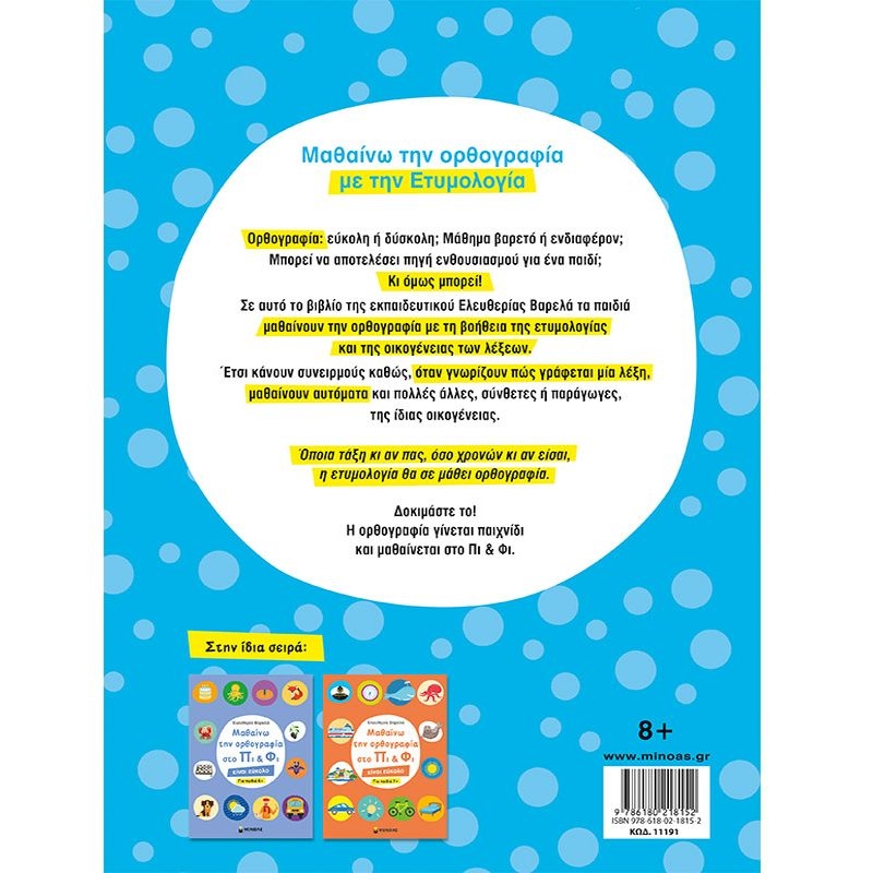 Σε αυτό το βιβλίο της εκπαιδευτικού Ελευθερίας Βαρελά τα παιδιά μαθαίνουν την ορθογραφία με τη βοήθεια της ετυμολογίας και της οικογένειας των λέξεων.
