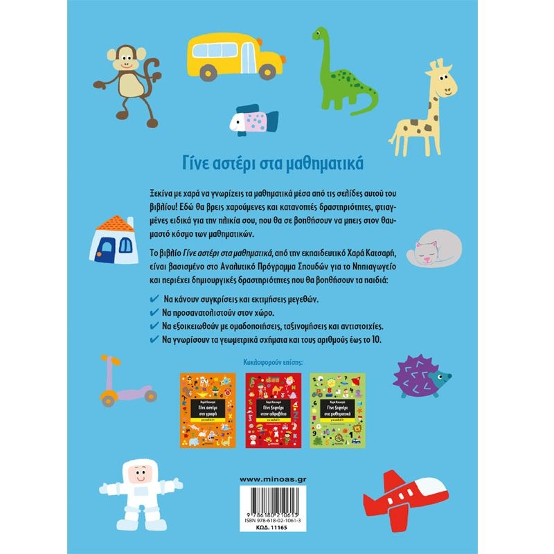 Το βιβλίο Γίνε αστέρι στα μαθηματικά, από την εκπαιδευτικό Χαρά Κατσαρή, είναι βασισμένο στο Αναλυτικό Πρόγραμμα Σπουδών για το Νηπιαγωγείο και περιέχει δημιουργικές δραστηριότητες που θα βοηθήσουν τα παιδιά: