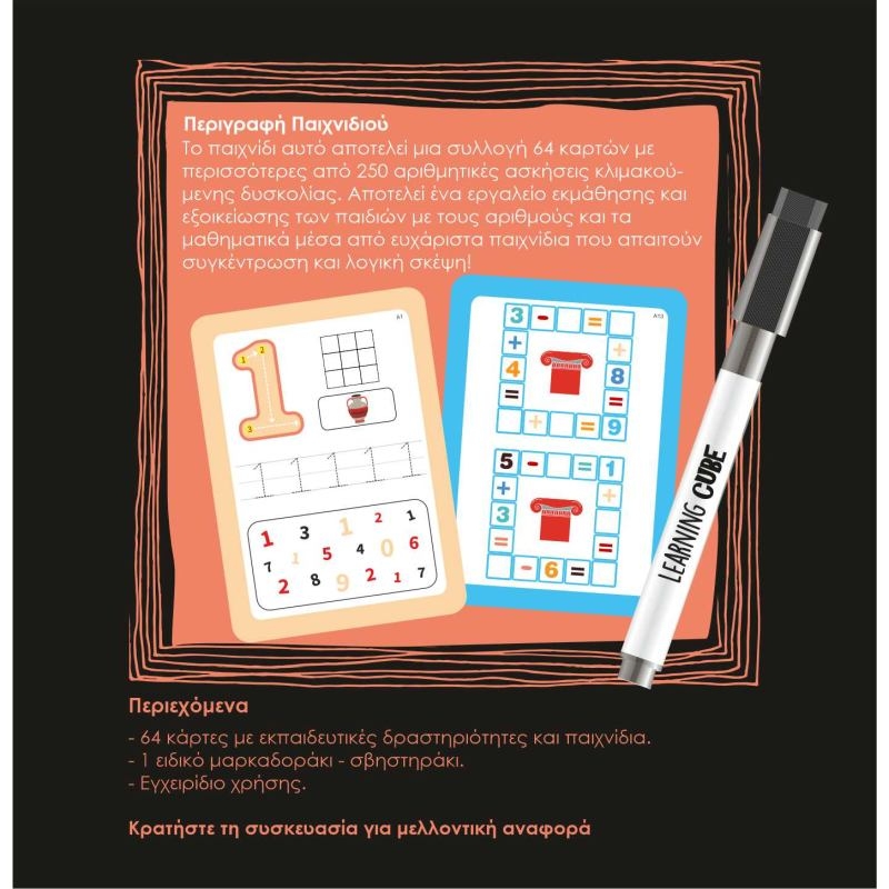 Σκοπός του παιχνιδιού το παιδί (ή τα παιδιά) να ολοκληρώσουν με επιτυχία όλες τις αριθμητικές δοκιμασίες τους δασκάλου Αρχιμήδη. Με τη βοήθεια του ειδικού μαρκαδόρου Learning Cube, τα παιδιά μπορούν να γράψουν, να σημειώσουν και να σβήσουν ατέλειωτες φορές πάνω στις κάρτες, να αυτο-διορθώνονται και να ολοκληρώνουν γρήγορα τις δραστηριότητες που απαιτούνται. Ένα παιχνίδι που θα κρατήσει δημιουργικά απασχολημένα τα παιδιά για ώρα, προσφέροντας τους πολύτιμες γνώσεις.