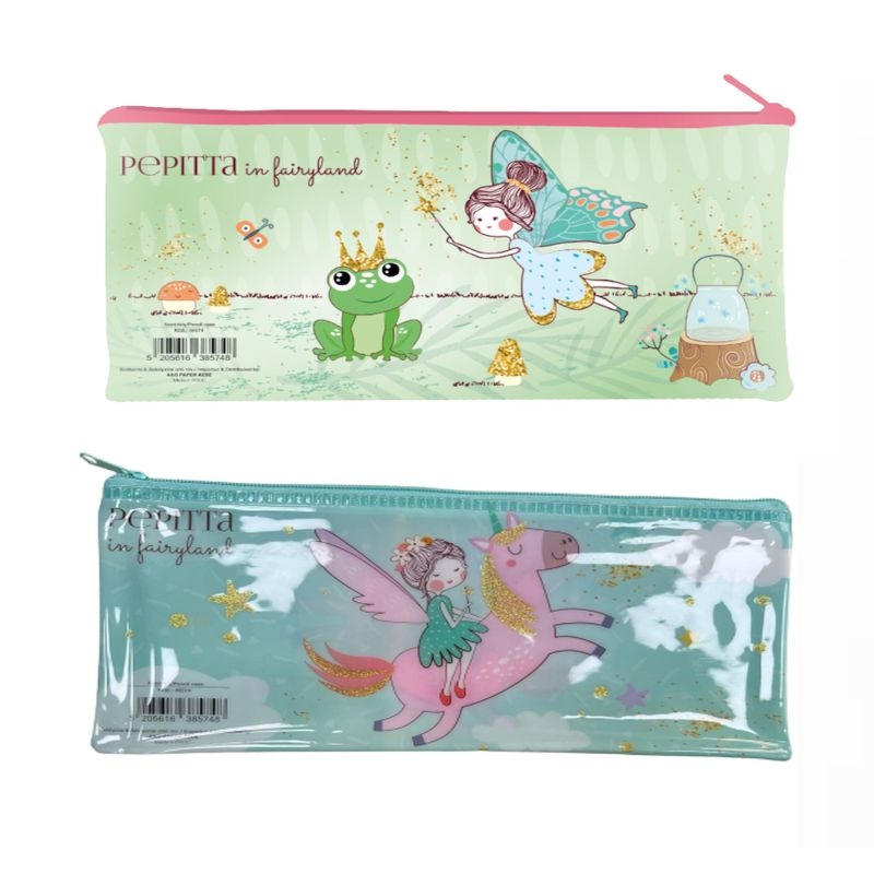 Όμορφη πλαστική κασετίνα Pepitta της A&G. Διαθέτει μία κεντρική θήκη και μεταλλικό φερμουάρ για να ασφαλίζει.