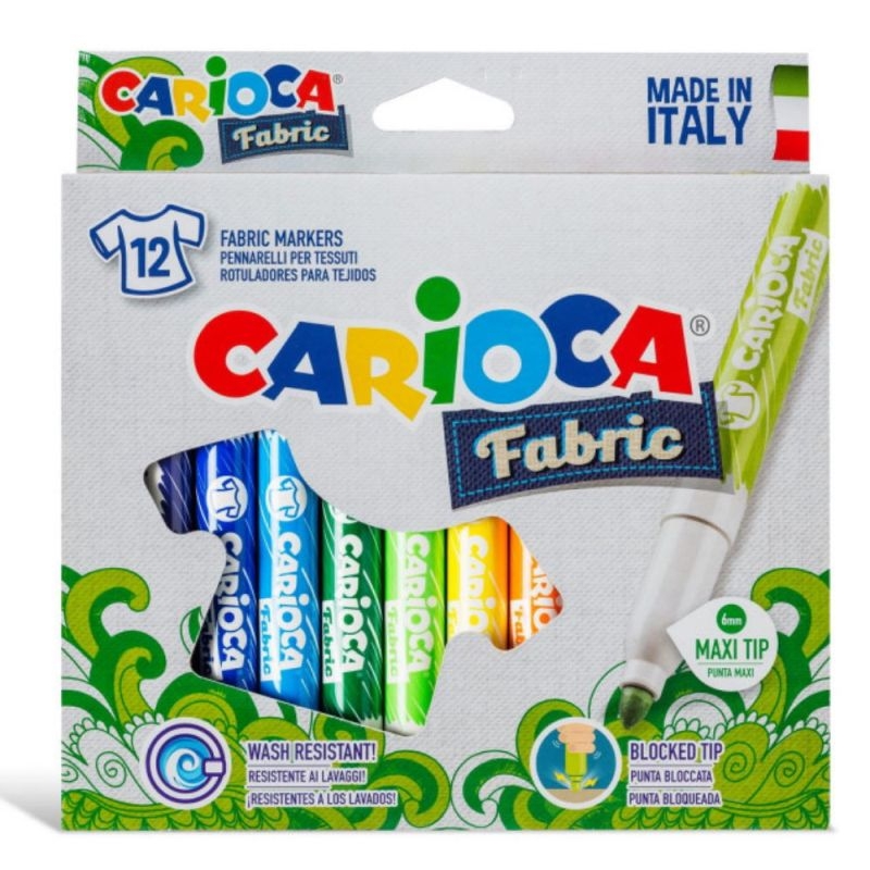 Μαρκαδόροι ανεξίτηλοι, ειδικοί για υφάσματα, 12 χρωμάτων από την Carioca. Δώστε τις δικές σας πινελιές στα ρούχα και ανανεώστε τα!
