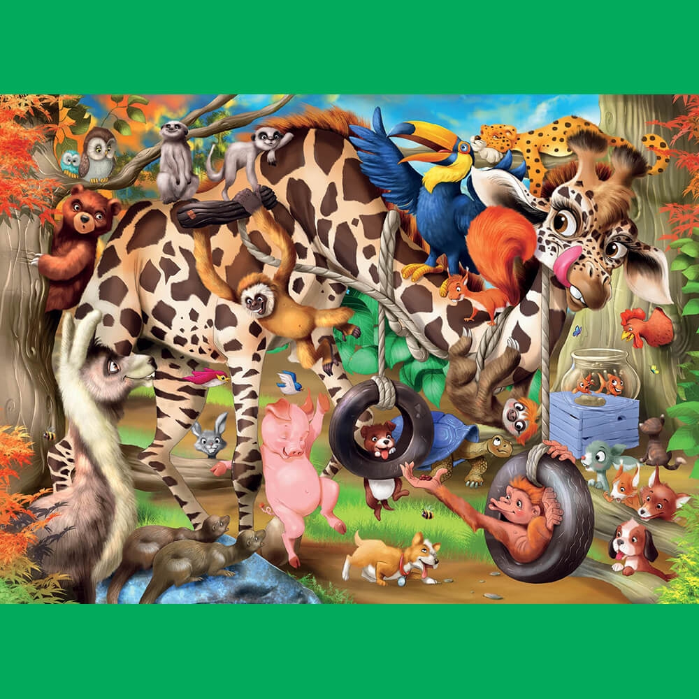 Χάος στο ζωικό βασίλειο! Συναρμολογήστε τα κομμάτια του παζλ για να δημιουργήσετε μια διασκεδαστική παράσταση γεμάτη γούνα και φτερά και ζωντανέψτε τη δράση. Με ανάγλυφα χνουδωτά κομμάτια, αυτό το παζλ είναι μια συναρπαστική εμπειρία για τα παιδιά . Τα κομμάτια του είναι μεγάλα και ανθεκτικά για εύκολο κράτημα στους μικρότερους λύτες, ώστε όλοι να μπορούν να απολαύσουν αυτή τη διασκεδαστική εμπειρία παζλ!