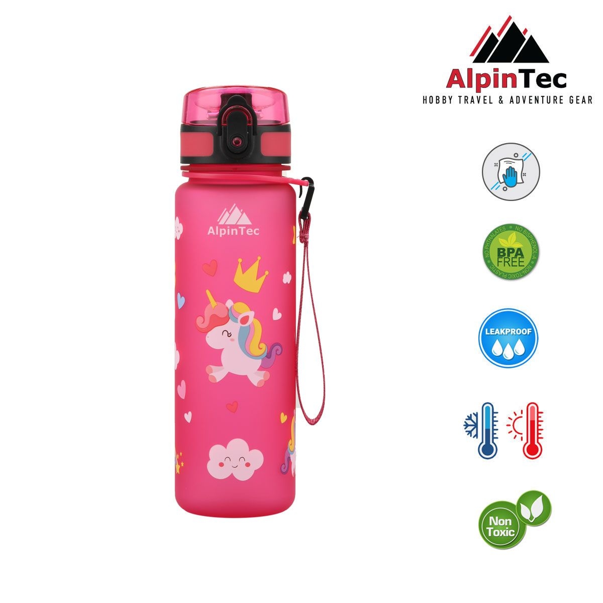 -Κατασκευασμένα με νέας γενιάς συμπολυεστέρα Tritan, τα παγούρια της AlpinTec είναι ασφαλή στη χρήση. Σε αντίθεση με τα πλαστικά υλικά που χρησιμοποιούνται στα συνηθισμένα παγούρια, το υλικό Τritan είναι απαλλαγμένο από δισφαινόλη Α (BPA), δισφαινόλη S (BPS), οιστρογονική δραστηριότητα (ΕΑ) και ανδρογονική δραστηριότητα (ΑΑ).