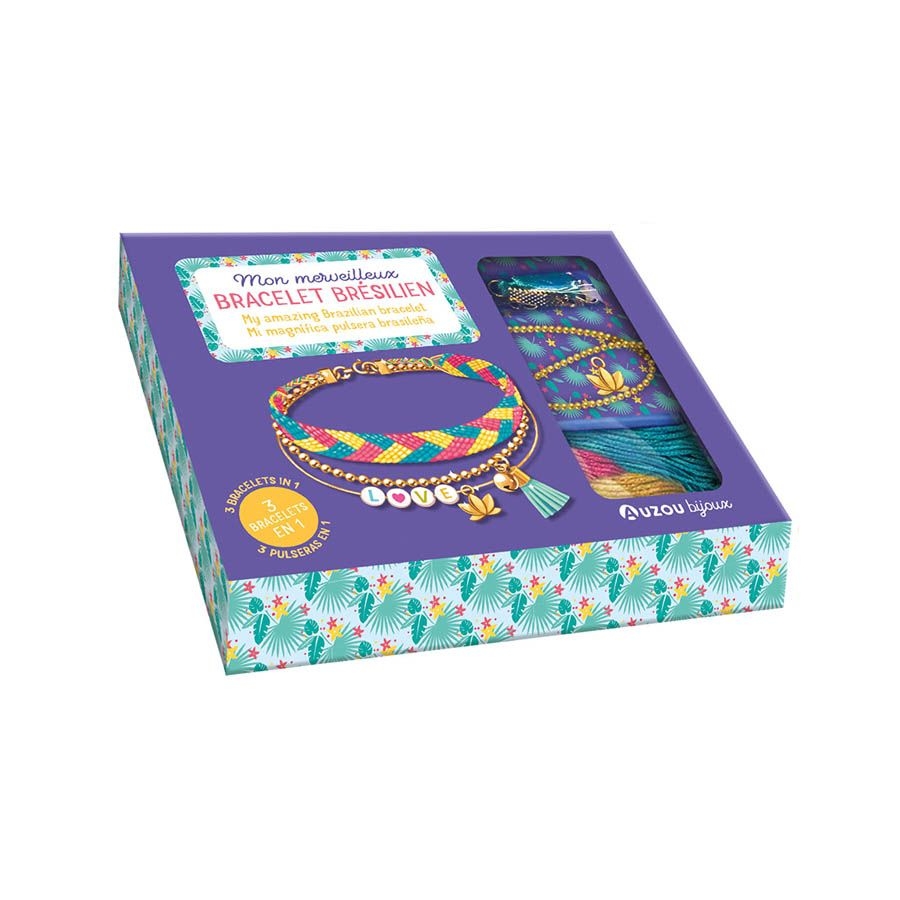 Γνωρίστε την ικανοποίηση και την απόλαυση του να φοράτε ένα κόσμημα που έχετε φτιάξει μόνοι σας! Η σειρά «Φτιάχνω Κοσμήματα», της αγαπημένης μας γαλλικής εταιρίας Auzou, διαθέτει μεγάλη γκάμα από πρωτότυπα, μοντέρνα και δημιουργικά κιτ κατασκευής κοσμημάτων. Βραχιόλια, κολιέ, δαχτυλίδια και πολλά άλλα, ανακαλύψτε τα όλα και δημιουργήστε τις πιο μοναδικές και καταπληκτικές συλλογές αξεσουάρ και κοσμημάτων! Το συγκεκριμένο κιτ περιλαμβάνει όλα όσα θα χρειαστείτε για να φτιάξετε 3 βραζιλιάνικα βραχιολάκια σε 1.