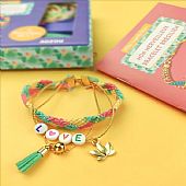 Περιλαμβάνει: Διάφορες πολύχρωμες κλωστές, 1 χρυσή αλυσίδα, χαντρούλες που σχηματίζουν τη λέξη "love", μία πράσινη φουντίτσα, 2 χρυσά φυλαχτά, κούμπωμα και 1 φυλλάδιο με οδηγίες βήμα προς βήμα.