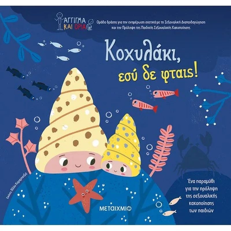 Κοχυλάκι, εσύ δε φταις! - Ένα παραμύθι για την πρόληψη της σεξουαλικής κακοποίησης των παιδιώνΠόσο χαρούµενο είναι το Κοχυλάκι όταν παίζει µε την παρέα του! Σήµερα ακόµα περισσότερο, γιατί βρήκε έναν καινούριο φίλο, τον Κάβουρα. Οι δυο τους απολαµβάνουν τις βουτιές και τα παιχνίδια στη θάλασσα. Τι γίνεται όµως όταν φτάνουν στον σκοτεινό βυθό; Ο Κάβουρας έχει αλλάξει… Το Κοχυλάκι φοβάται αλλά βρίσκει το θάρρος να φύγει µακριά.