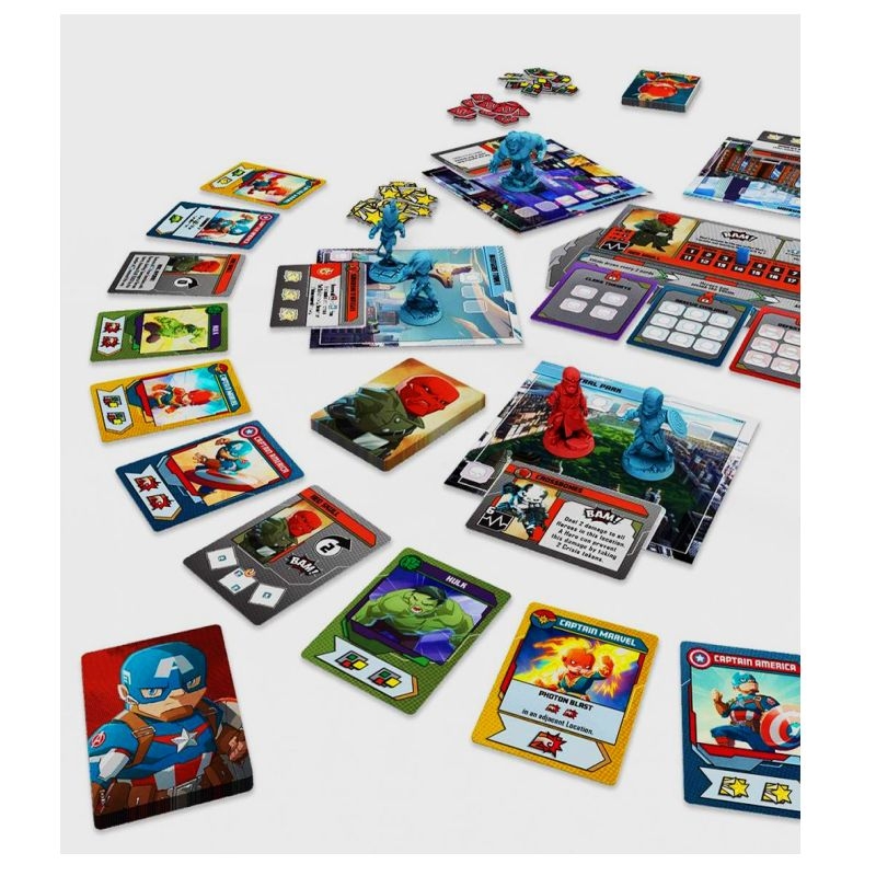 Περιλαμβάνει: 7 Φιγούρες Υπερηρώων, 3 Φιγούρες Εγκληματιών, 84 Κάρτες Υπερηρώων, 3 Πίνακες Εγκληματιών, 36 Κάρτες Απώτερων Σκοπών, 18 Κάρτες Απειλών, 8 Τοποθεσίες, 1 Οδηγός Αποστολών, 3 Κάρτες Αποστολών, 3 Κάρτες Προκλήσεων, 156 Δείκτες, 1 Δείκτης Εγκληματία, 1 Βιβλίο Οδηγιών,