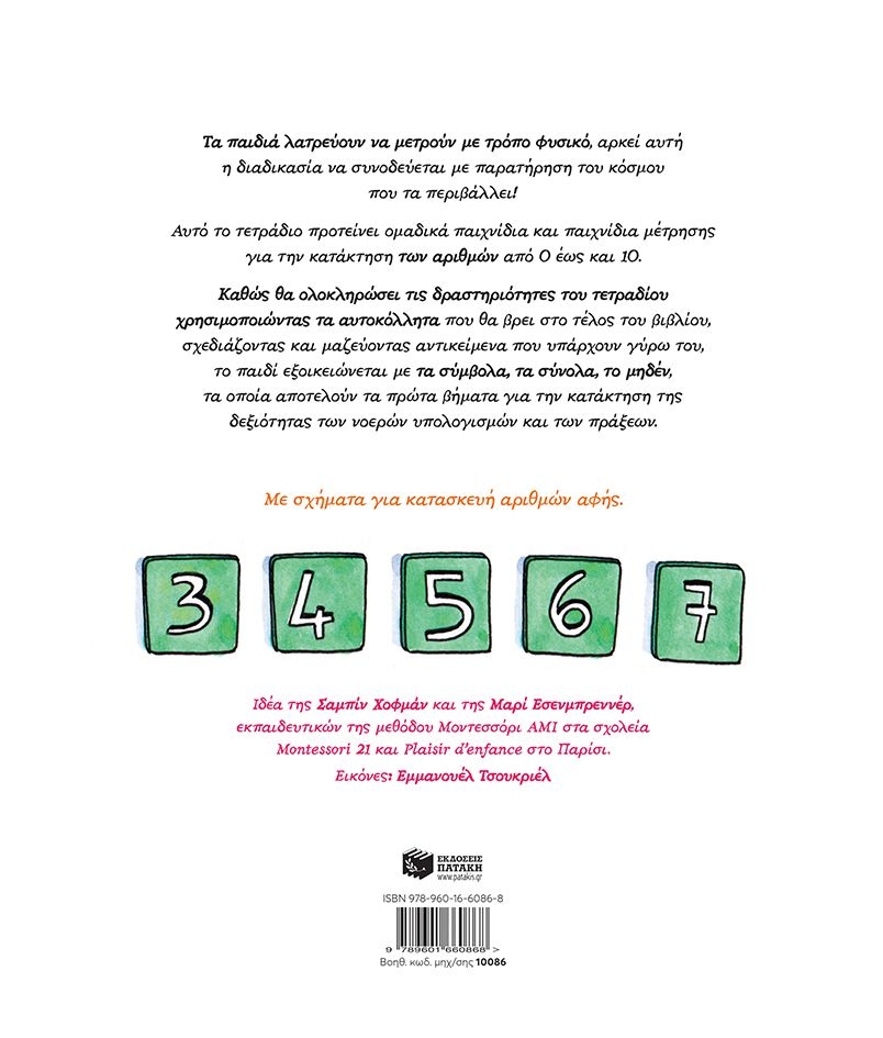 Καθώς θα ολοκληρώσει τις δραστηριότητες του τετραδίου χρησιμοποιώντας τα αυτοκόλλητα που θα βρει στο τέλος του βιβλίου, σχεδιάζοντας και μαζεύοντας αντικείμενα που υπάρχουν γύρω του, το παιδί εξοικειώνεται με τα σύμβολα, τα σύνολα, το μηδέν, τα οποία αποτελούν τα πρώτα βήματα για την κατάκτηση της δεξιότητας των νοερών υπολογισμών και των πράξεων.