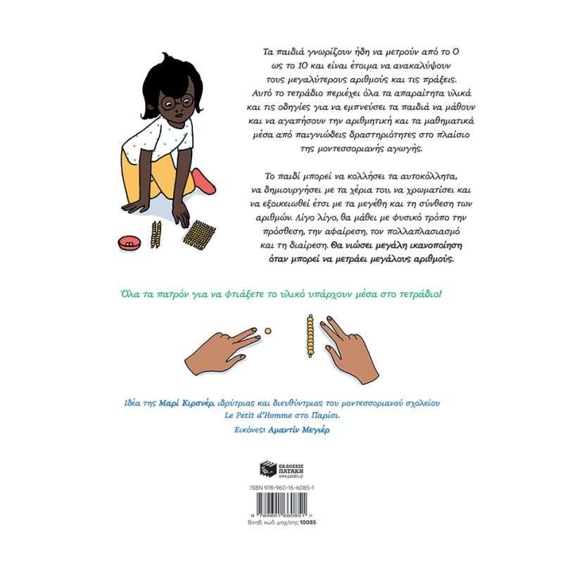 Τα παιδιά γνωρίζουν ήδη να μετρούν από το 0 ως το 10 και είναι έτοιμα να ανακαλύψουν τους μεγαλύτερους αριθμούς και τις πράξεις. Αυτό το τετράδιο περιέχει όλα τα απαραίτητα υλικά και τις οδηγίες για να εμπνεύσει τα παιδιά να μάθουν και να αγαπήσουν την αριθμητική και τα μαθηματικά μέσα από παιγνιώδεις δραστηριότητες στο πλαίσιο της μοντεσσοριανής αγωγής.