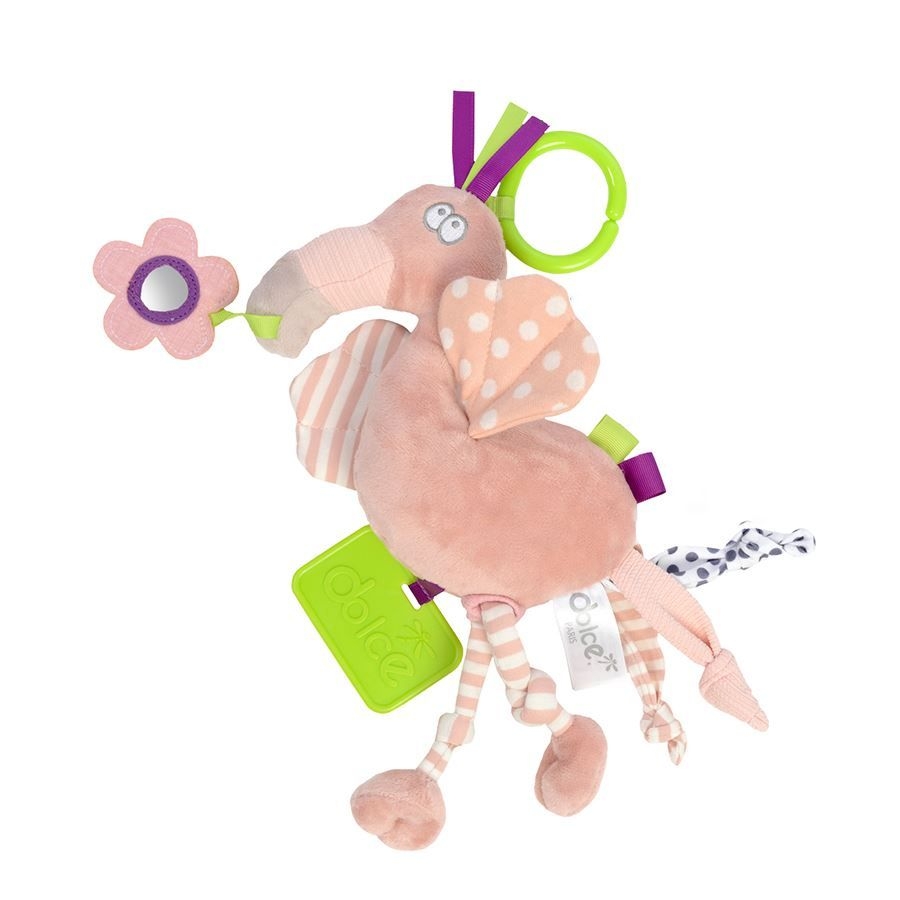 Το αξιαγάπητο φλαμίνγκο της Dolce θα σας ξετρελάνει. Διαθέτει πολλά υφάσματα και κορδέλες για να τα εξερευνήσει το παιδί, ενώ περιλαμβάνει επίσης ένα μασητικό σιλικόνης σε φωτεινά χρώματα, μια κουδουνίστρα και πολλά άλλα. Διαθέτει ακόμα μια λαβή για να το κρεμάτε στην κούνια ή το καρότσι και να το έχετε πάντα μαζί σας. Θα ενισχύσει το συντονισμό χεριού-ματιού, την επιδεξιότητα, την ακοή, τα δόντια και την υφή των παιδιών.