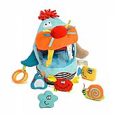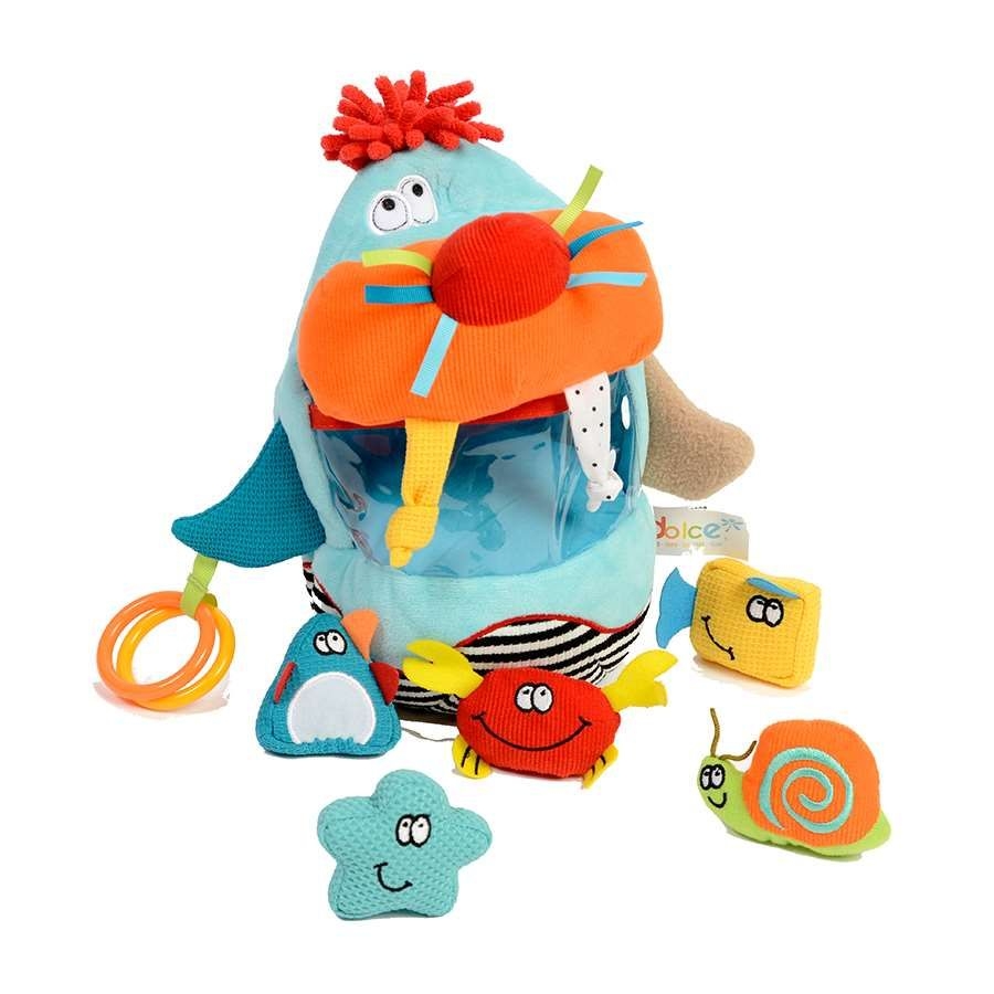 Αυτός ο διασκεδαστικός θαλάσσιος ίππος αποτελείται από πολλά υλικά διαφορετικής υφής και περιλαμβάνει πέντε μικρούς θαλάσσιους χαρακτήρες: ένα καβούρι, ένα ψάρι, έναν αστερία, ένα σαλιγκάρι και έναν πιγκουίνο. Διαθέτει επίσης δακτύλιους που κουδουνίζουν, κορδέλες και κόμπους που θα προσκαλέσουν το παιδί να τα ανακαλύψει και να εξασκήσει τις αισθήσεις του.