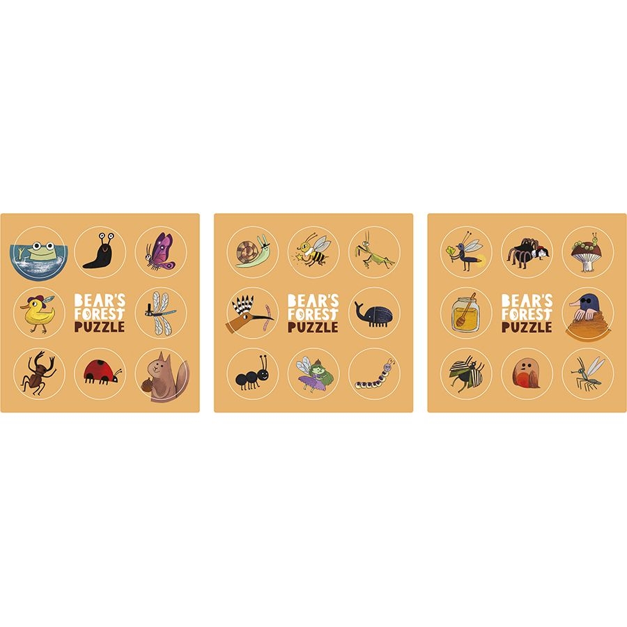 Στο δάσος της μικρής αρκούδας, υπάρχουν πολλές εκπλήξεις! Συναρμολογήστε το παζλ και έπειτα προσπαθήστε να τις ανακαλύψετε όλες! Διασκεδάστε με τις ώρες ψάχνοντας τα ζωύφια και τα πλάσματα του δάσους που εικονίζονται στις 24 μάρκες, στη μεγάλη εικόνα.