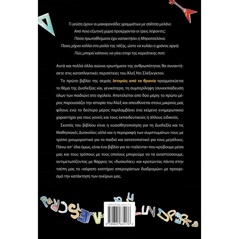 Το πρώτο βιβλίο της σειράςΙστορίες από τα θρανίαπραγματεύεται το θέμα της Δυσλεξίας και, γενικότερα, τη συμπερίληψη (συνεκπαίδευση όλων των παιδιών) στο σχολείο. Αποτελείται από δύο μέρη: το πρώτο μέρος παρουσιάζει την ιστορία του Άλεξ και απευθύνεται στους μικρούς μας φίλους ενώ το δεύτερο μέρος περιλαμβάνει ένα κείμενο ενημερωτικού χαρακτήρα για τους γονείς και τους εκπαιδευτικούς ή άλλους ειδικούς.