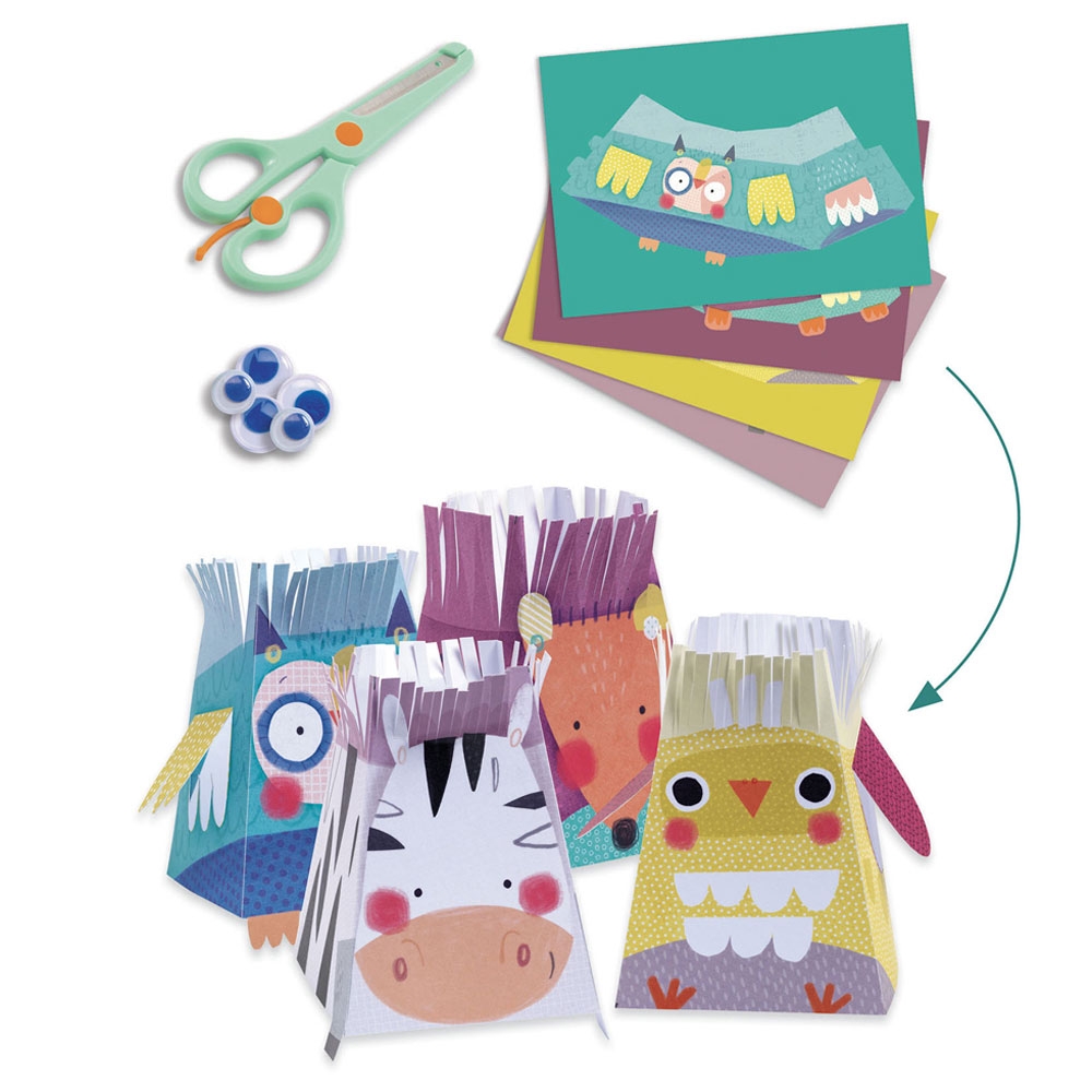 -Χειροτεχνία: 4 τυπωμένα φύλλα με 1 ψαλίδι ασφαλείας και 8 googly μάτια για να κατασκευάσετε τα 3D ζωάκια.