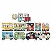 Επιβιβαστείτε, το τραίνο ξεκινά! Συναρμολογήστε τα 10 διαφορετικά παζλ-βαγόνια 3 κομματιών το καθένα, βάλτε τα στη σειρά και έπειτα τοποθετείστε τις ξύλινες μάρκες με τους αριθμούς από το ένα μέχρι το δέκα στο κέντρο τους.