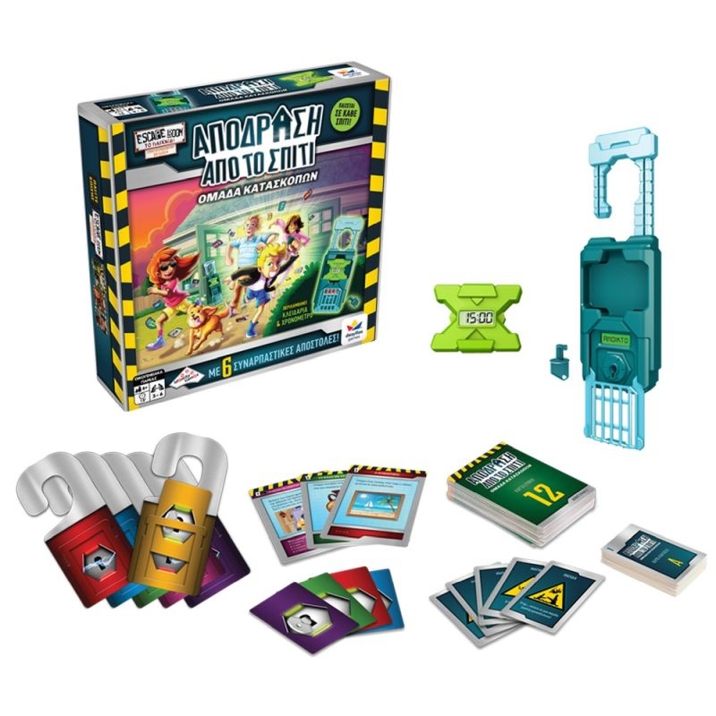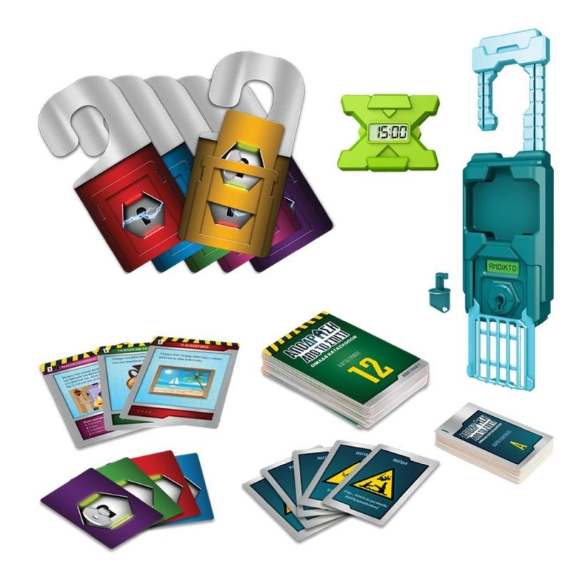 Περιλαμβάνει: 6 αποστολές, κλειδαριά πόρτας, κλειδί πόρτας, χρονόμετρο, 78 κάρτες γρίφων, 56 κάρτες απαντήσεων, 6 λουκέτα πορτών, καρτέλα βαθμολογίας και ορισμού περιοχών και οδηγίες παιχνιδιού.