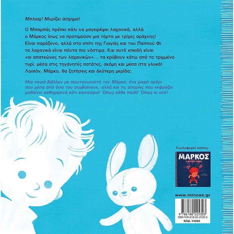 Ο Μπαμπάς πρέπει πάλι να μαγειρέψει λαχανικά, αλλά ο Μάρκος ίσως να προτιμούσε μια τάρτα με τρίχες αράχνης! Είναι παράξενο, αλλά στο σπίτι της Γιαγιάς και του Παππού Φι τα λαχανικά είναι πάντα πιο νόστιμα. Και αυτό επειδή είναι «οι απατεώνες των λαχανικών»… τα κρύβουν κάτω από το τριμμένο τυρί, μέσα στις τηγανητές πατάτες, ακόμη και μέσα στα γλυκά! Λοιπόν, Μάρκο, θα ζητήσεις και δεύτερη μερίδα;