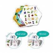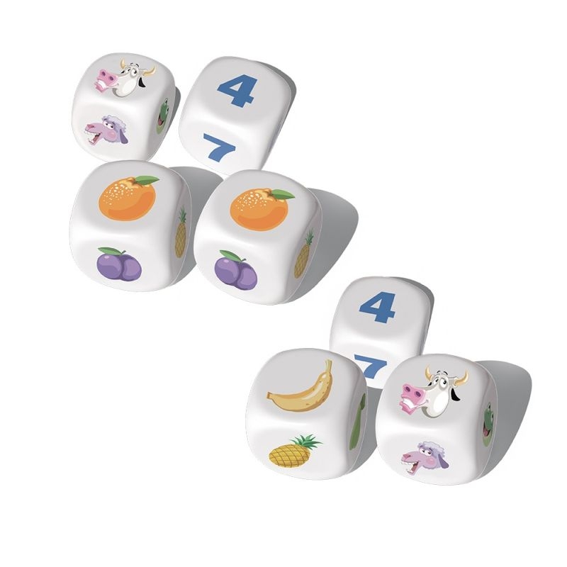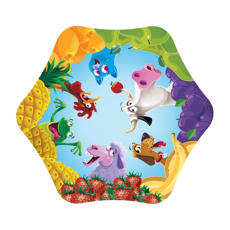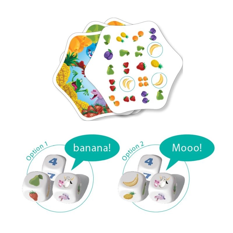 Περιλαμβάνει: 40 κάρτες φρούτων (6 διαφορετικά φρούτα), 4 ζάρια (1 αριθμών, 1 ζώων, και 2 ζάρια φρούτων) καθώς και οδηγίες.
