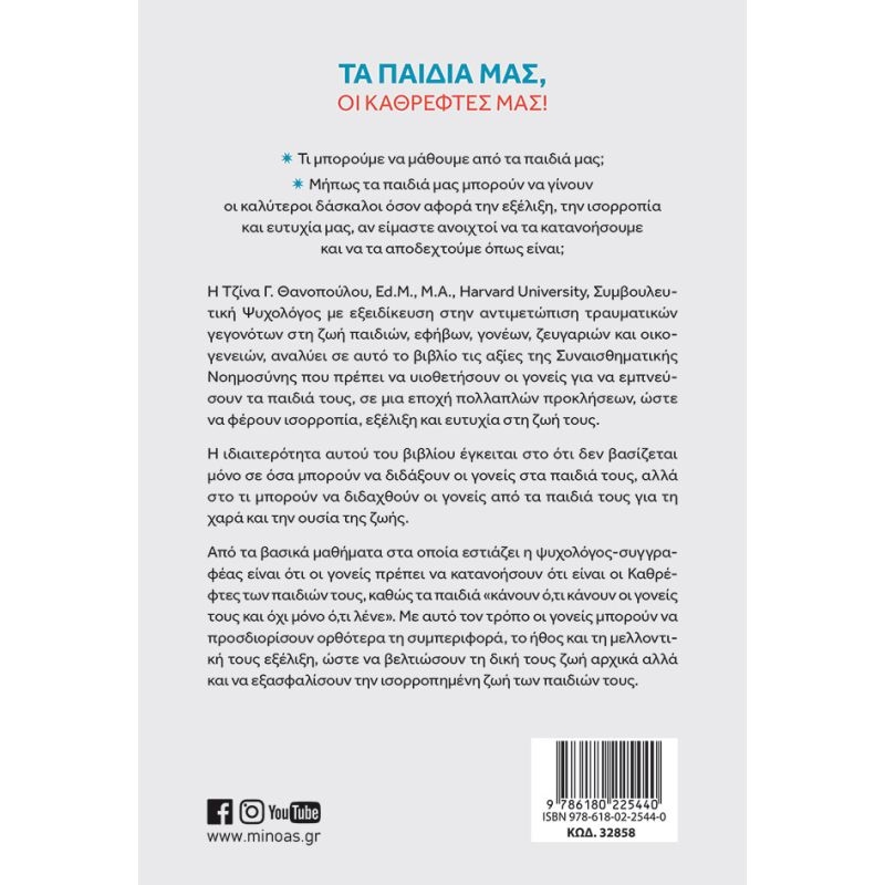 Η Τζίνα Γ. Θανοπούλου, Ed.M., M.A., Harvard University, Συμβουλευτική Ψυχολόγος με εξειδίκευση στην αντιμετώπιση τραυματικών γεγονότων στη ζωή παιδιών, εφήβων, γονέων, ζευγαριών και οικογενειών, αναλύει σε αυτό το βιβλίο τις αξίες της Συναισθηματικής Νοημοσύνης που πρέπει να υιοθετήσουν οι γονείς για να εμπνεύσουν τα παιδιά τους, σε μια εποχή πολλαπλών προκλήσεων, ώστε να φέρουν ισορροπία, εξέλιξη και ευτυχία στη ζωή τους.