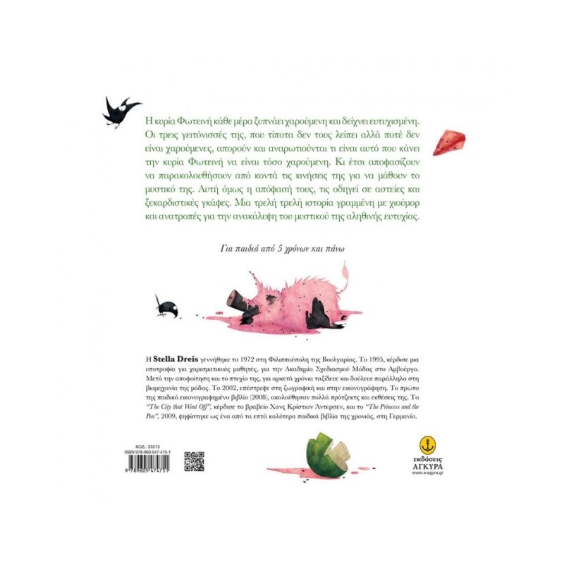 Η κυρία Φωτεινή κάθε μέρα ξυπνάει χαρούμενη και δείχνει ευτυχισμένη. Οι τρεις γειτόνισσές της, που τίποτα δεν τους λείπει αλλά ποτέ δεν είναι χαρούμενες, απορούν και αναρωτιούνται τι είναι αυτό που κάνει την κυρία Φωτεινή να είναι τόσο χαρούμενη. Κι έτσι αποφασίζουν να παρακολουθήσουν από κοντά τις κινήσεις της για να μάθουν το μυστικό της. Αυτή όμως η απόφασή τους, τις οδηγεί σε αστείες και ξεκαρδιστικές γκάφες. Μια τρελή τρελή ιστορία γραμμένη με χιούμορ και ανατροπές για την ανακάλυψη του μυστικού της αληθινής ευτυχίας.