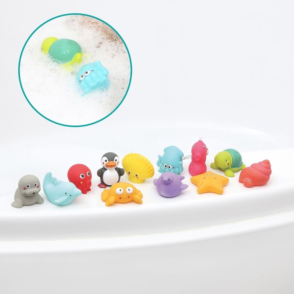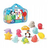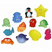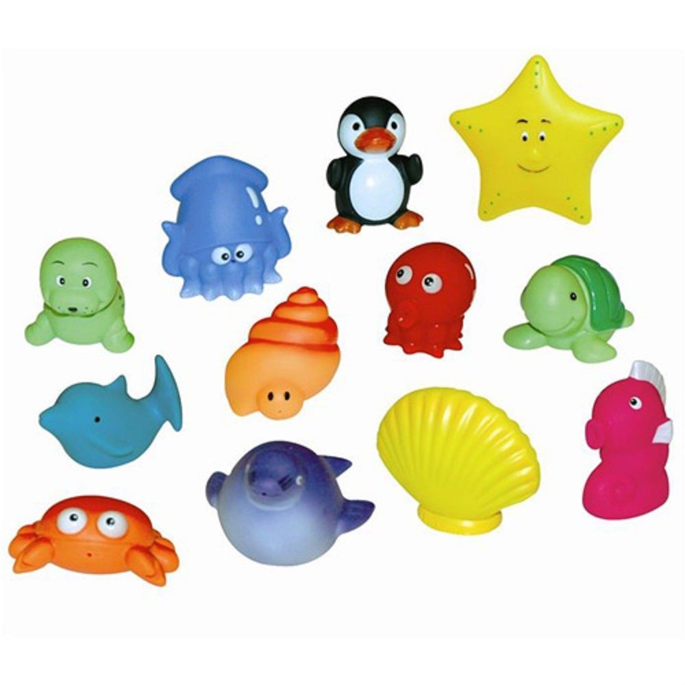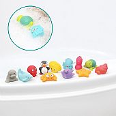Το σετ περιλαμβάνει: Δελφίνι, 2 φώκιες, χελώνα, χταπόδι, κοχύλι, καβουράκι, αστέρι, σουπιά, κοχύλι, πιγκουίνο, ιππόκαμπο. Μετά τη χρήση αποστραγγίστε τα παιχνίδια και ξεπλύνετε τακτικά / πλύνετε με καθαρό νερό.
