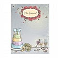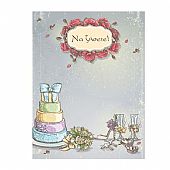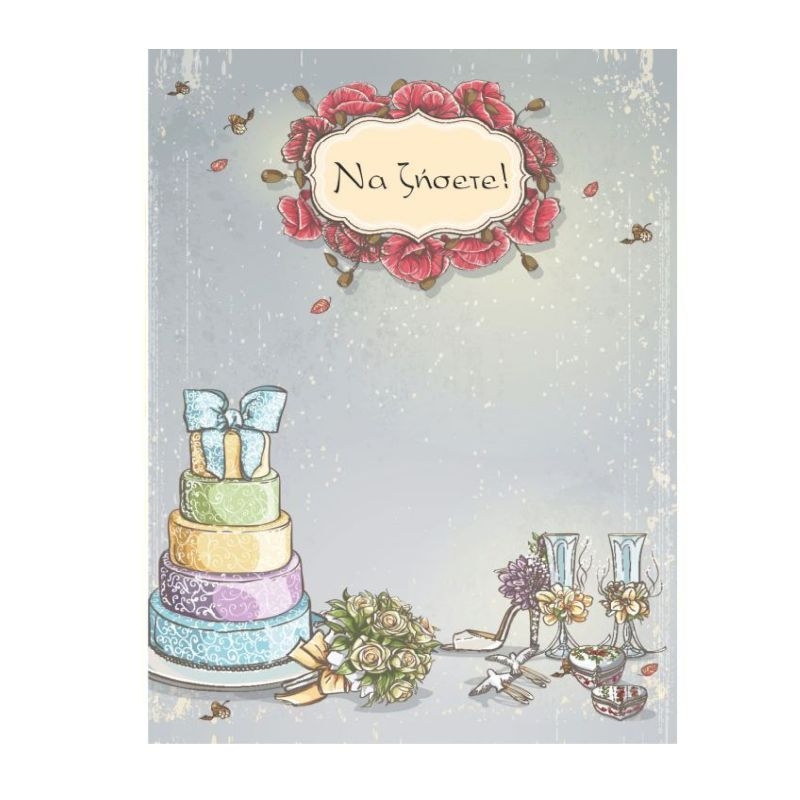 Ευχετήρια κάρτα διακοσμημένη με μια γαμήλια τούρτα και 2 ποτήρια με σαμπάνια και λεκτικό "Να ζήσετε" και φάκελο στο εσωτερικό της. Ιδανική για τις ευχές γάμου από τον Μανιάκα.