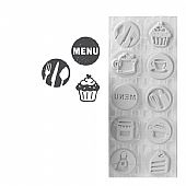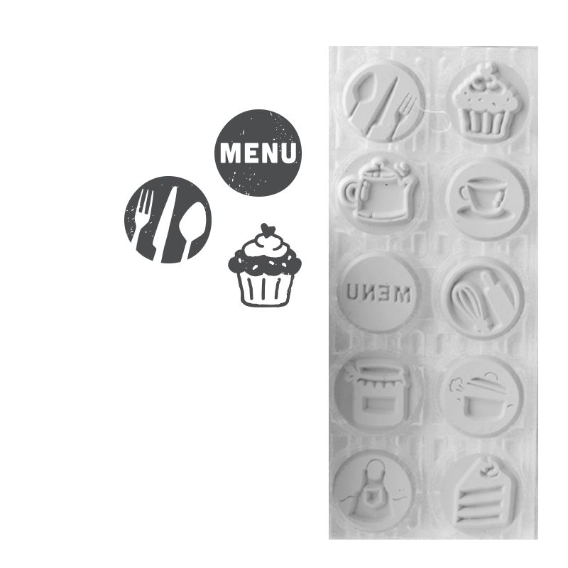 Περιέχονται: 1 στρόγγυλη σφραγίδα και 10 μοτίβα εικόνων με θέμα την κουζίνα και τσιμπίδα για την τοποθέτηση των μοτίβων.