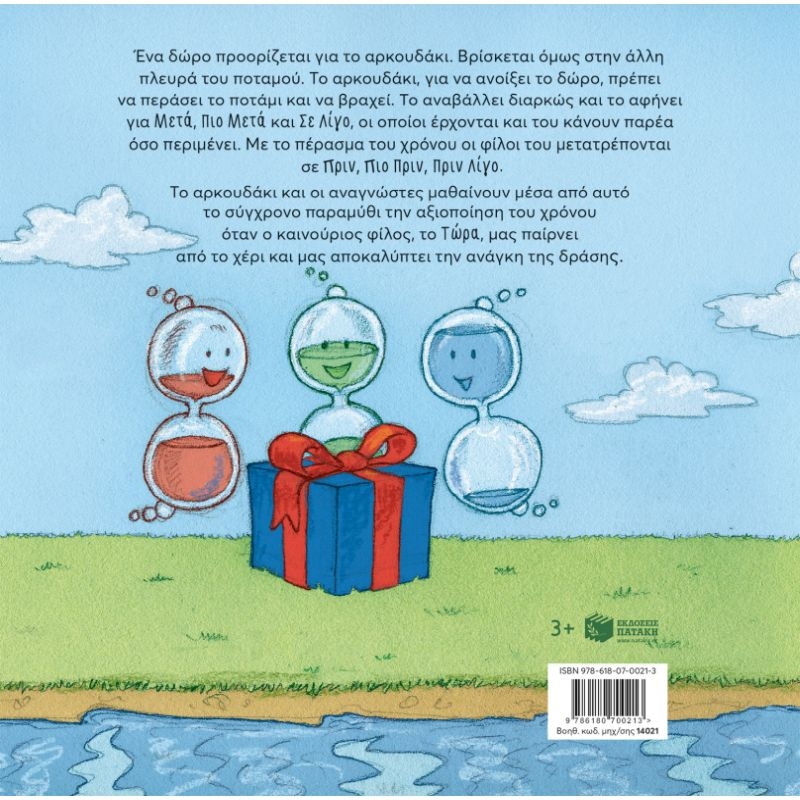 Ένα δώρο προορίζεται για το αρκουδάκι. Βρίσκεται όμως στην άλλη πλευρά του ποταμού. Το αρκουδάκι, για να ανοίξει το δώρο, πρέπει να περάσει το ποτάμι και να βραχεί. Το αναβάλλει διαρκώς και το αφήνει για Μετά, Πιο Μετά και Σε Λίγο, οι οποίοι έρχονται και του κάνουν παρέα όσο περιμένει. Με το πέρασμα του χρόνου οι φίλοι του μετατρέπονται σε Πριν, Πιο Πριν, Πριν Λίγο.