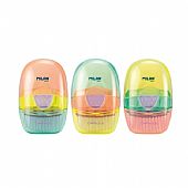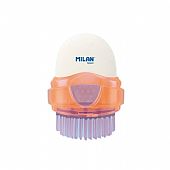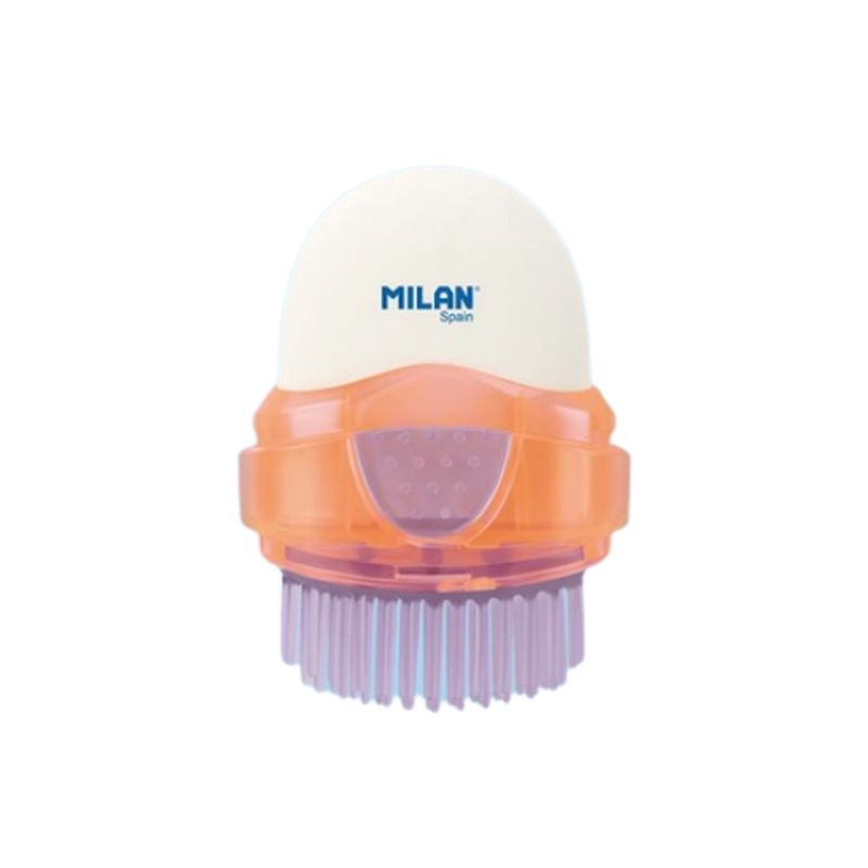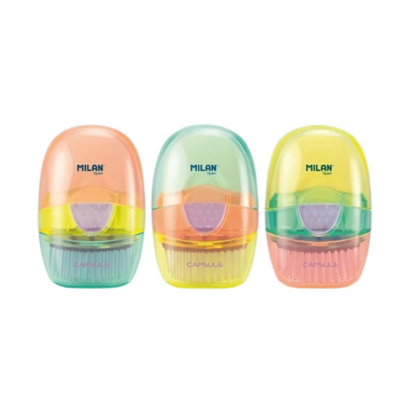 Η Milan προσφέρει άλλο ένα πρωτοποριακό προϊόν! Σβήστρα και βουρτσάκι μαζί, σε pastel χρώματα. Στο επάνω μέρος διαθέτει λεία σβήστρα που ασφαλίζει με καπάκι και στο κάτω μέρος ειδικό βουρτσάκι με καπάκι, για να καθαρίζετε τα υπολείμματα.