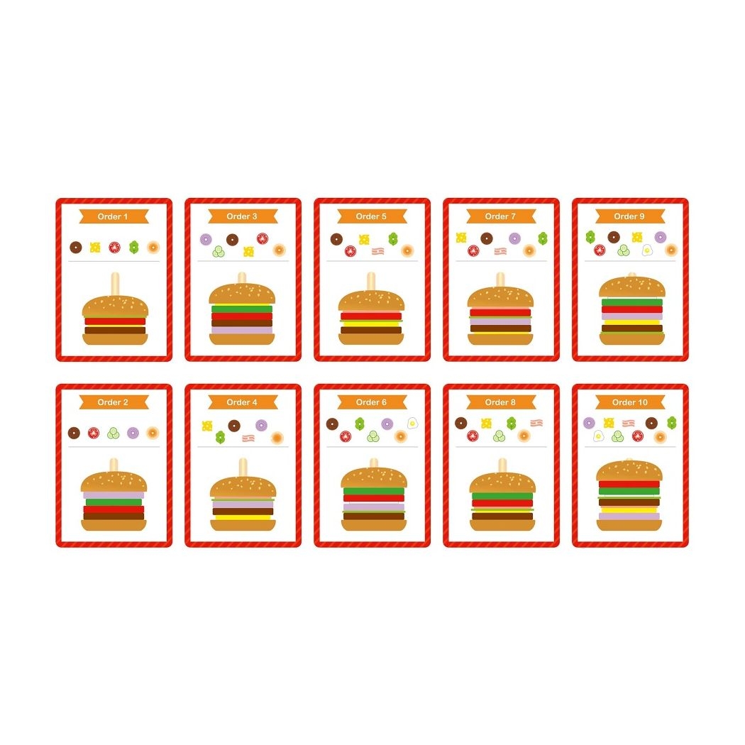 Περιλαμβάνει: Ψωμάκι, τυρί, μπιφτέκι, αυγό, κρεμμύδι, ντομάτα, μπέικον, αγγούρι και μαρούλι) για την παρασκευή ενός λαχταριστού μπέργκερ και 10 κάρτες με διαφορετικά μενού.