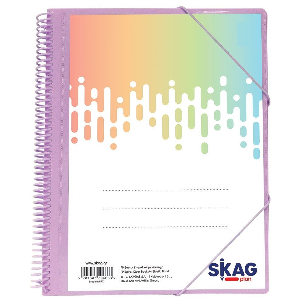 Premium ντοσιέ σουπλ σπιράλ pastel μοβ με 30 ενσωματωμένες διαφάνειες και λάστιχο για να κλείνει, της skag.