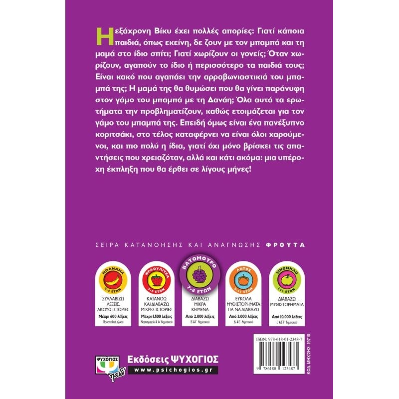 Η εξάχρονη Βίκυ έχει πολλές απορίες: Γιατί κάποια παιδιά, όπως εκείνη, δε ζουν με τον μπαμπά και τη μαμά στο ίδιο σπίτι; Γιατί χωρίζουν οι γονείς; Όταν χωρίζουν, αγαπούν το ίδιο ή περισσότερο τα παιδιά τους; Είναι κακό που αγαπάει την αρραβωνιαστικιά του μπαμπά της; Η μαμά της θα θυμώσει που θα γίνει παράνυφη στον γάμο του μπαμπά με τη Δανάη; Όλα αυτά τα ερωτήματα την προβληματίζουν καθώς ετοιμάζεται για τον γάμο του μπαμπά της. Επειδή όμως είναι ένα πανέξυπνο κοριτσάκι, στο τέλος καταφέρνει να είναι όλοι χαρούμενοι, και πιο πολύ η ίδια, γιατί όχι μόνο βρίσκει τις απαντήσεις που χρειαζόταν, αλλά και κάτι ακόμα: μια υπέροχη έκπληξη που θα έρθει σε λίγους μήνες!